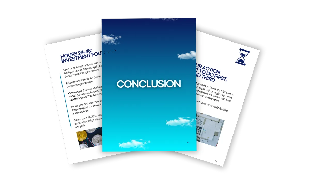 You'll receive the complete digital guide that covers all of the knowledge you need on investing (Investment Foundation, Real Estate Entry Strategy, Smart Market Investing, and Wealth Automation Framework). Each section provides detailed instructions and formulas you can implement immediately to start building your wealth, just as I did.